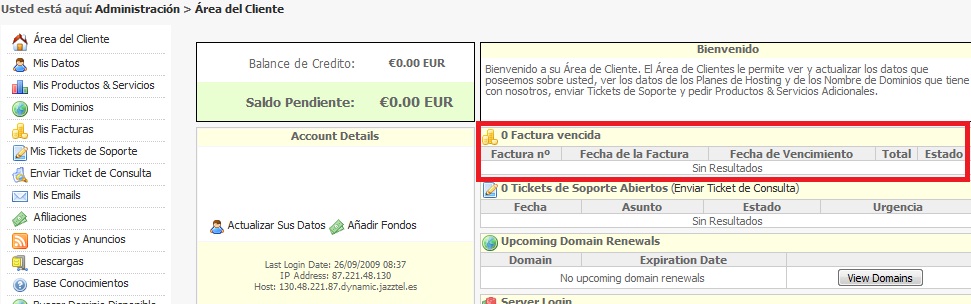 Otra de las formas de ver sus facturas pendientes, es en la propia area de cliente, donde se muestra un resumen de todos sus servicios. Ahi encontrara la opcion "facturas vencidas" donde le apareceran las facturas que usted debe pagar: