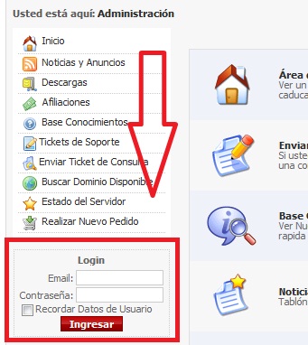 Acceda a su panel de control de cliente (http://clientes.mundiserver.com), y hacer login con sus datos con los cuales se registro como cliente: