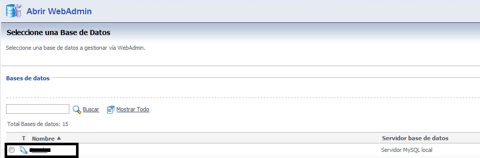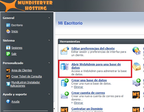 2) En el escritorio de su panel plesk, seleccione "Abrir webadmin para una base de datos"