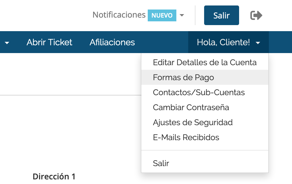 2) Una vez dentro, vamos a "Formas de Pago", que se encuentra en el menú superior, pulsando en "Hola!, Nombre", se abre un desplegable con varias opciones, entre ellas, la mencionada.